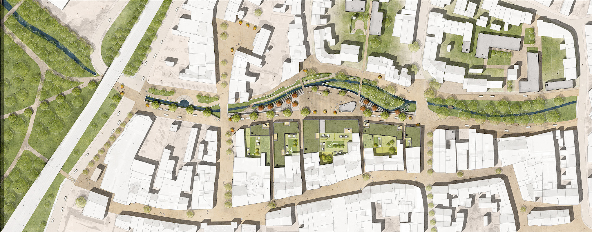 Unser Konzept zur Umgestaltung des Gustav-Regler-Platzes am Seffersbach in Merzig verfolgt den Ansatz, aus der „2.Reihe“ selbstbewusst und qualitätvoll hervorzutreten, um die Stadtbildpflege von innen heraus zu fördern und den Informationsgehalt und die Qualität der Freiräume zu stärken. Der durch die Umgestaltung des Stadtparks begonnene Transformationsprozess soll dabei als konsequenter Übergang zum Seffersbach gewertet werden. Eine bauliche Abrundung lässt den Gustav-Regler-Platz nun auch räumlich erleben.