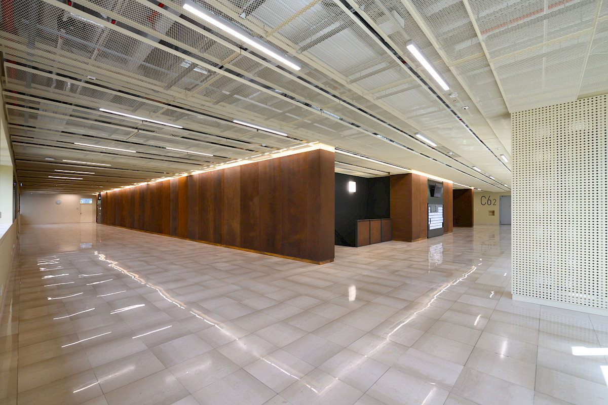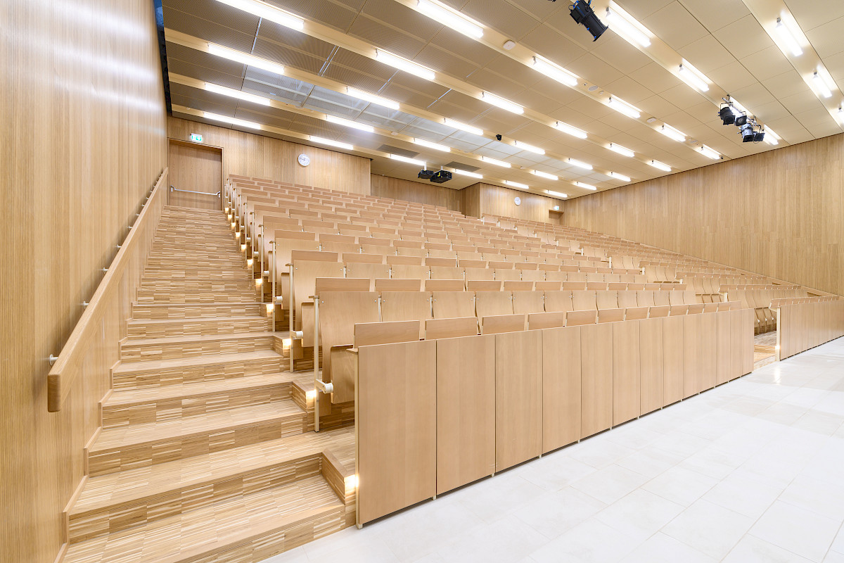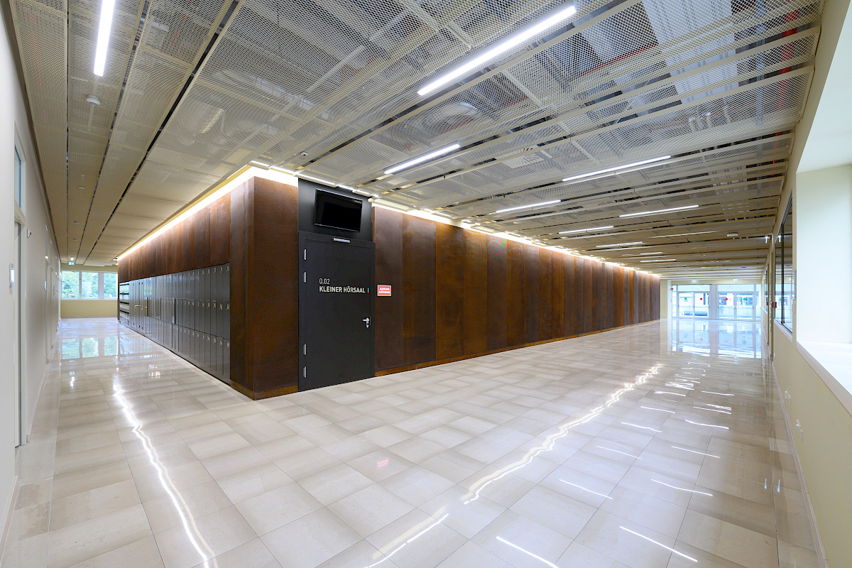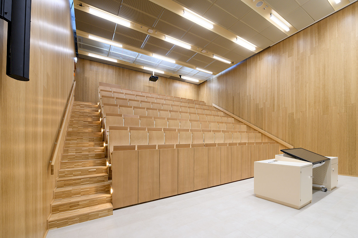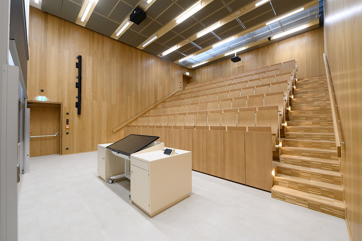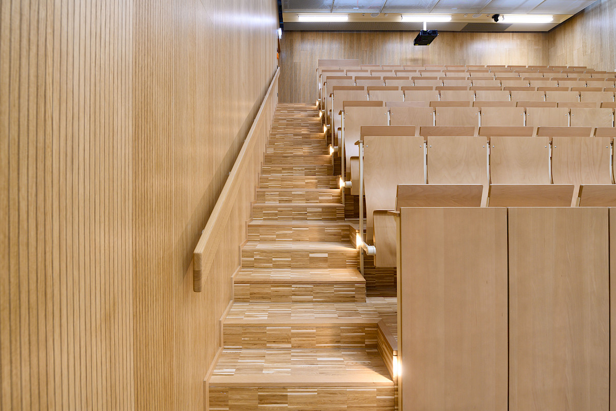Die Modernisierungsarbeiten am Gebäude Chemie 4.3 an der Universität Saarbrücken umfassten die Renovierung der beiden Hörsäle (zwei kleinere und eines größeren Hörsaals). Darüber hinaus wurden das Foyer sowie die notwendigen Versorgungseinrichtungen im unteren Geschoss, wie Technikräume und Sanitäranlagen, auf den neuesten Stand gebracht. Eine auffällige gestalterische Komponente war die Verwendung von Cortenstahl, der in Form einer Streckmetallverkleidung die beiden Hörsäle einheitlich umfasst, während im Inneren der Hörsäle Holz zur Gestaltung der Bekleidung und Möbel verwendet wurde. Innerhalb dieser Verkleidung wurden speziell für die Studierenden neue Spinde eingerichtet, und zusätzlich wurde eine Informationstafel installiert, die zur besseren Orientierung und Kommunikation beiträgt.
