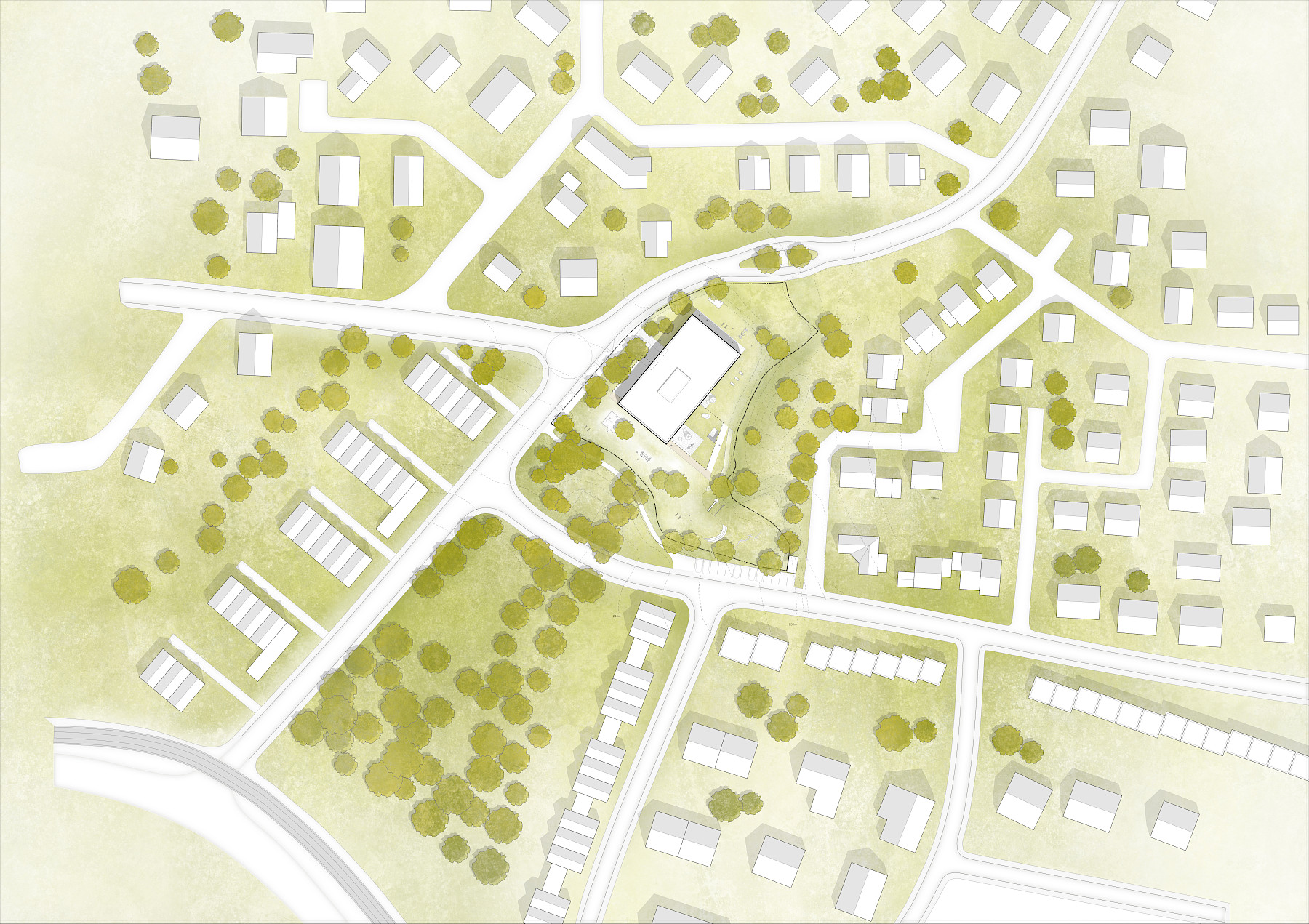 Ein in seiner Staffelung des Geländes anspruchsvolles Baufeld, eingebettet in eine heterogene städtebauliche Nachbarschaft und umgebenen von einer Bebauung, welche in Formensprache, Materialität und Maßstäblichkeit divergiert, setzen die Rahmenbedingungen für den konzeptionellen, städtebaulichen Lösungsansatz. Ein kompaktes, zweigeschossiges Konzept ermöglicht die Nutzung der verbleibenden Freiraumresourcen für vielfältige Angebote.