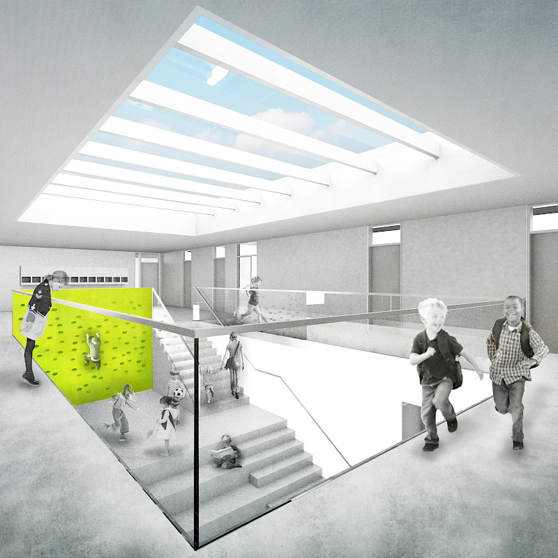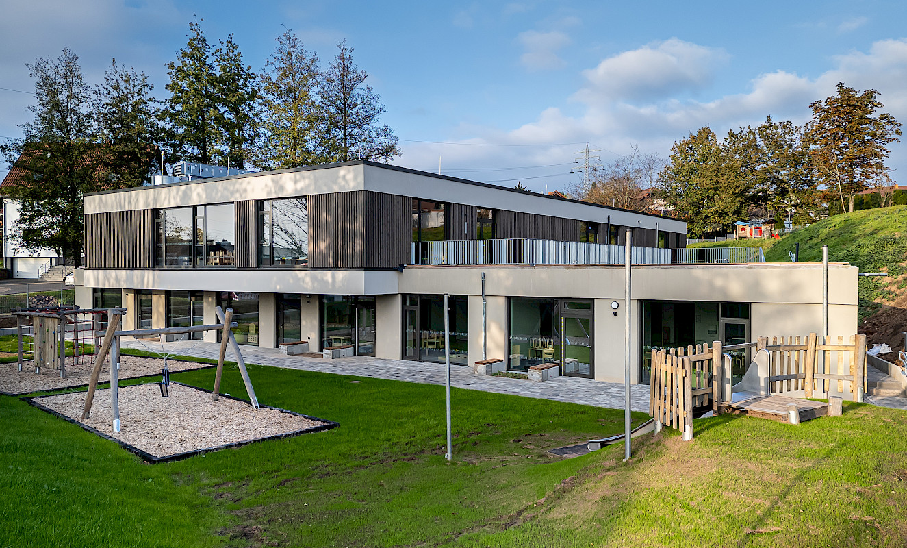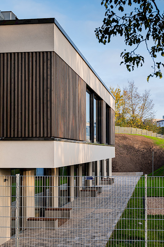 Ein in seiner Staffelung des Geländes anspruchsvolles Baufeld, eingebettet in eine heterogene städtebauliche Nachbarschaft und umgebenen von einer Bebauung, welche in Formensprache, Materialität und Maßstäblichkeit divergiert, setzen die Rahmenbedingungen für den konzeptionellen, städtebaulichen Lösungsansatz. Ein kompaktes, zweigeschossiges Konzept ermöglicht die Nutzung der verbleibenden Freiraumresourcen für vielfältige Angebote.