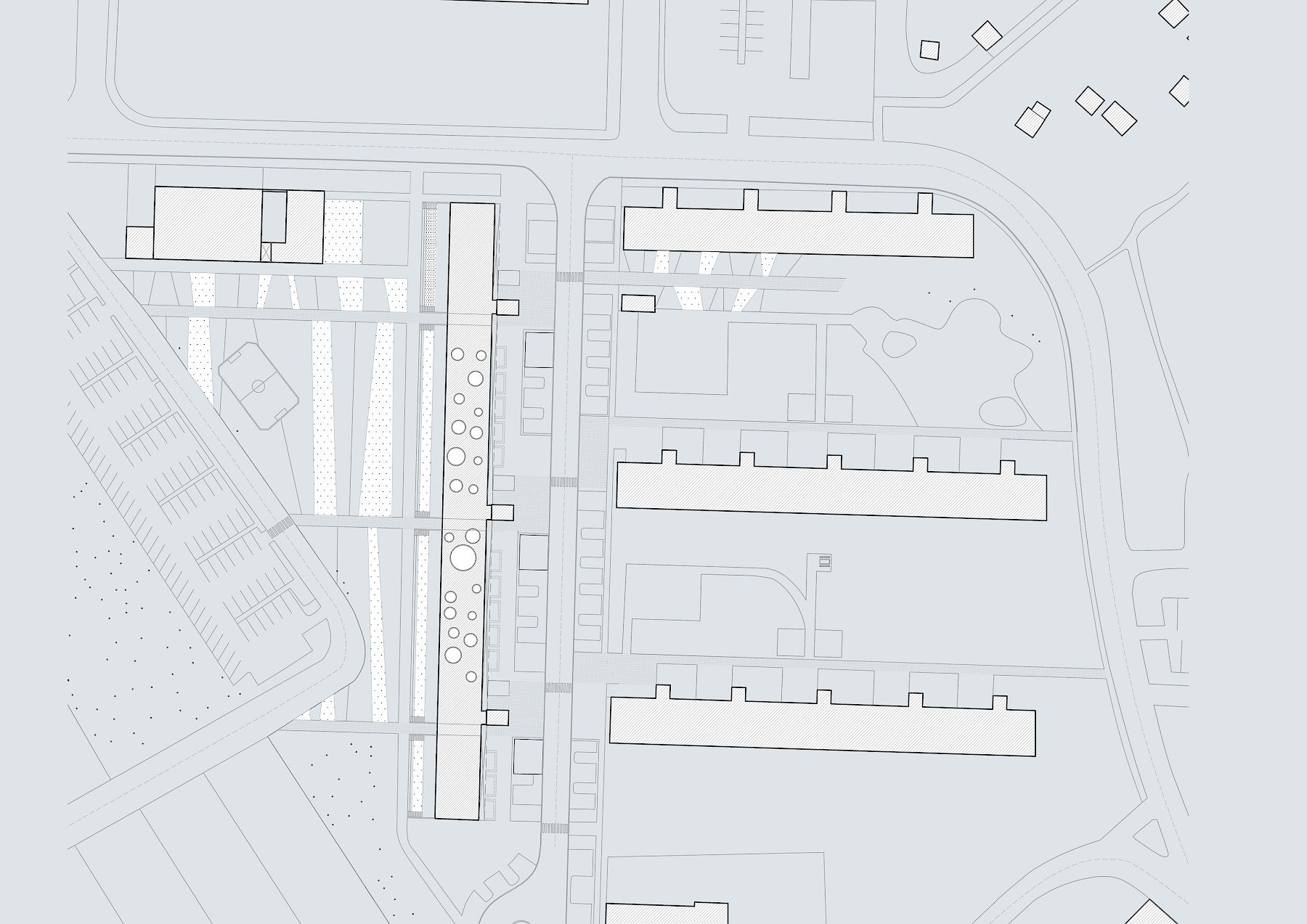 Die Erdgeschosszone, welche in ihrer Funktion durch individuelle Wohnungseingänge geprägt ist, erfährt durch eine attraktivere Gestaltung, eine Aufwertung. Durch die Ansiedlung neuer, quartiersbezogener Nutzungen, können spontane Kontakte innerhalb der Siedlung geknüpft und auf diese Weise das soziale Gefüge und Zusammengehörigkeitsgefühl der Bewohner gestärkt werden.