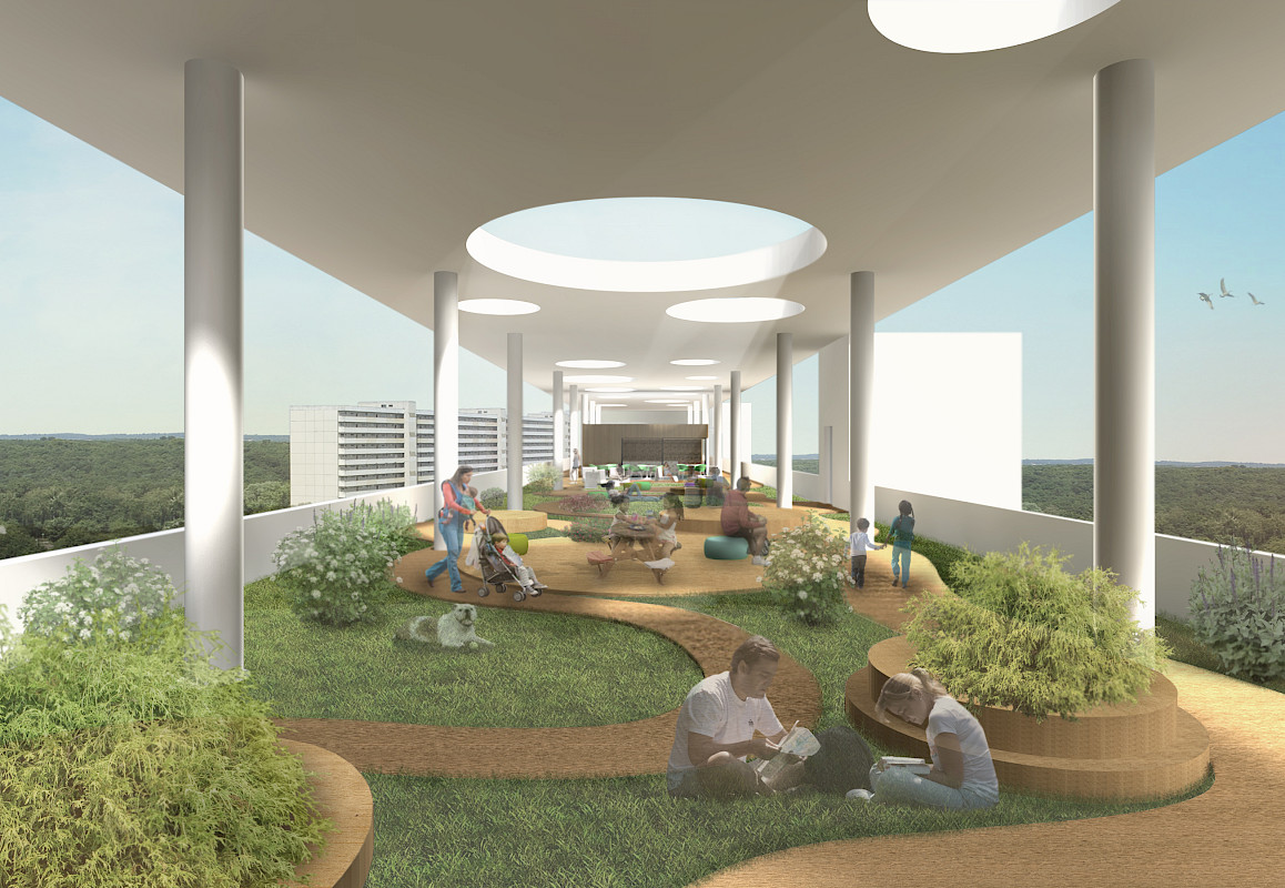 An oberster Stelle des Gebäudes wird ein neuer zentraler Ort der Begegnung und Kommunikation geschaffen. Die Mittelbauten der beiden obersten Geschosse werden rückgebaut und geben somit Raum für die Gestaltung eines Dachgartens. Diese Terrasse bietet einen eindrucksvollen Blick über Saarbrücken und die umgebende Landschaft. Zwei Pavillons im Park, die etwa als Café der Gemeinwesenarbeit oder als Raum für Feierlichkeiten genutzt werden können, laden zum Verweilen ein und beleben den Dachgarten zusätzlich.