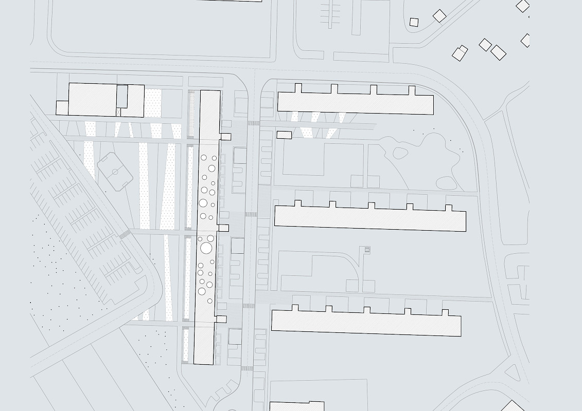 Die Erdgeschosszone, welche in ihrer Funktion durch individuelle Wohnungseingänge geprägt ist, erfährt durch eine attraktivere Gestaltung, eine Aufwertung. Durch die Ansiedlung neuer, quartiersbezogener Nutzungen, können spontane Kontakte innerhalb der Siedlung geknüpft und auf diese Weise das soziale Gefüge und Zusammengehörigkeitsgefühl der Bewohner gestärkt werden.