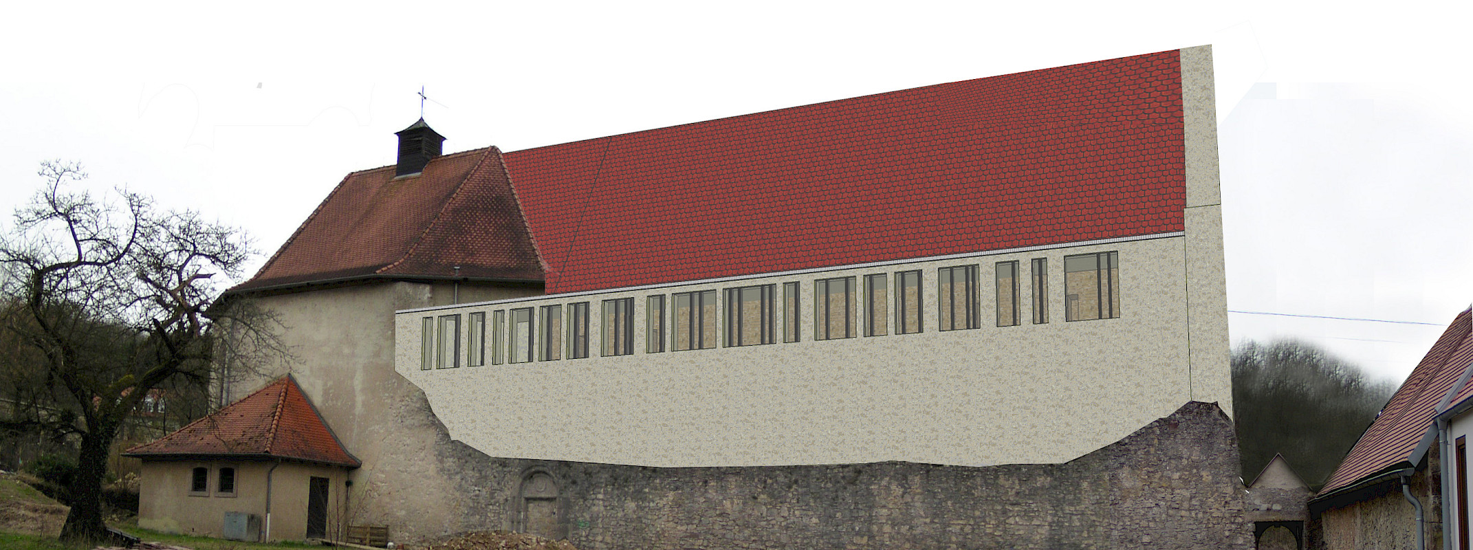 Die Konzeption der neuen Kirche orientiert sich an der Struktur mittelalterlicher Abteikirchen, insbesondere an Cluny. So wird der Entwurf der neuen Kirche unter anderem im Inneren durch ein sogenanntes “architektonisches Zitat” bestimmt, einem eingestellten Torso, der neben der Tonnenwölbung auch Proportionen und Maßverhältnisse der Klosterkirche Cluny III aufnimmt. Das neue Gebäude wird im Sinne einer Inkorporation (Haus in Haus-Lösung) in der Ruine der ehemaligen Prioratskirche postiert, ohne eine materielle Verbindung zum Altbestand.