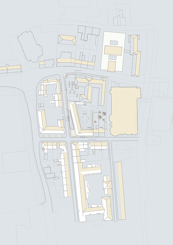 In den Baufluchten der beiden Straßen werden die Baukörper durch einen Rücksprung in der obersten Ebene im Stadtraum überwiegend dreigeschossig wahr genommen. Die gewählte städtebauliche Form der Randbebauung geht schonend mit den Flächenressourcen um und stellt sicher, dass für die Bewohner des Alten-und Pflegeheimes und der neuen Anlage ein großzügiger Freiraum verbleibt und eine Verschattung des Bestandes vermieden wird. Der Klosterhof selbst bietet Raum für vielfältige Formen der Begegnung und kontemplative Ruhe. Felder mit Heil- und Duftpflanzen verstärken diesen Charakter.