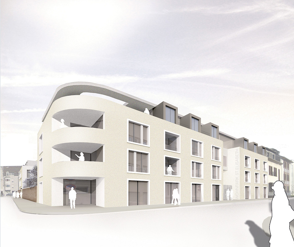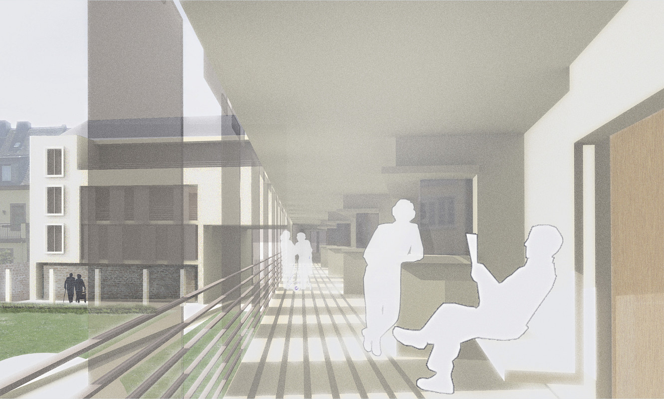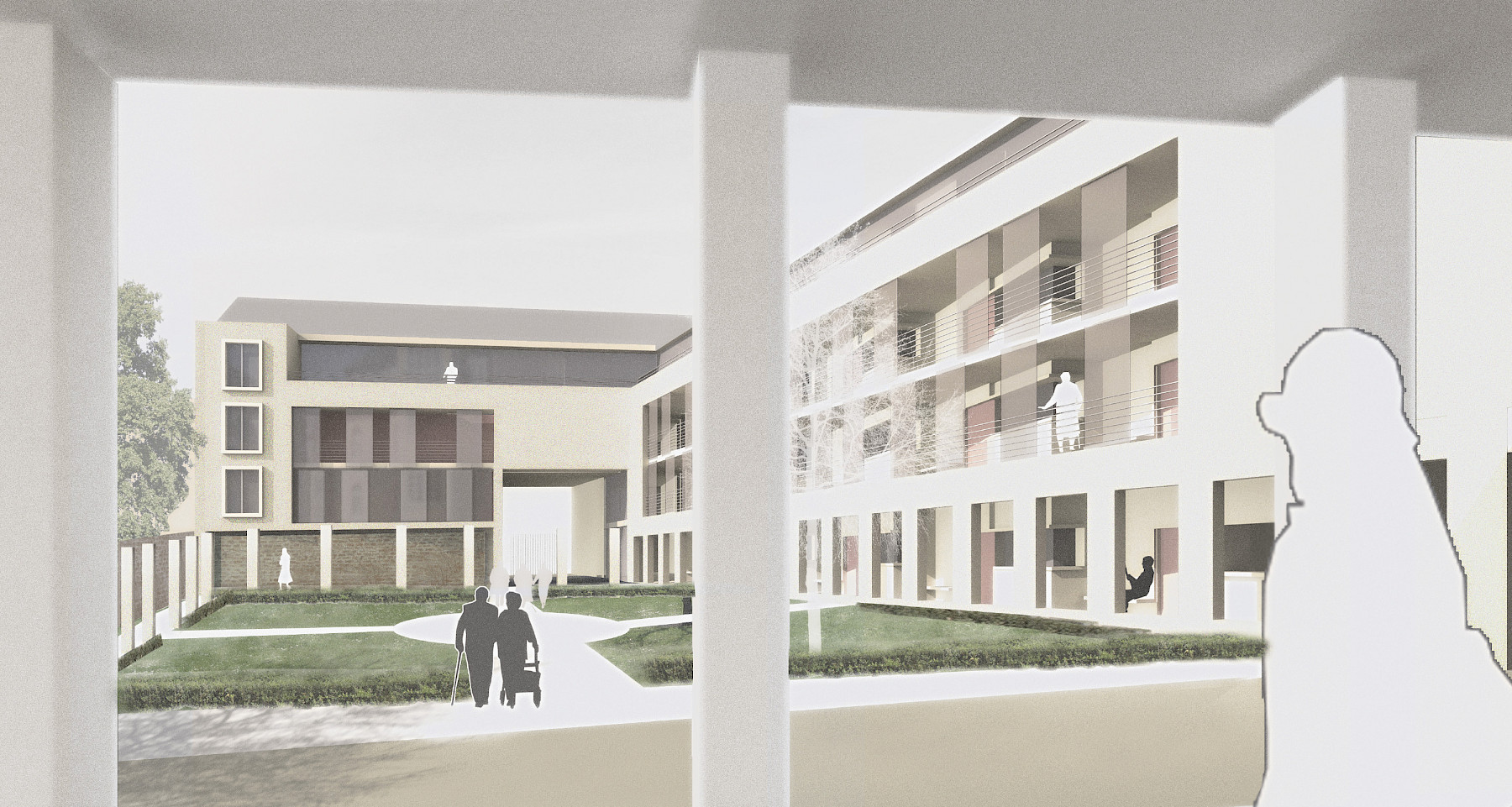 Die ursprüngliche Nutzung des Ortes als Kloster und kontemplativer Ort als übergeordnetes Thema haben wir unserem Entwurfskonzept als Ausgangspunkt zugrunde gelegt. Die Wohnanlage orientiert und gruppiert sich um einen Kreuzgang mit Klosterhof als Herz der Anlage. Auf diese Weise erfährt die Bebauung des Altenheimes eine sinnfällige Ergänzung und bauliche Fassung des Klosterhofes. Dieses Bebauungsprinzip ermöglicht eine größtmögliche Freihaltung des Außenraumes, so dass der neu entstandene gestaltete Raum eine neue Bedeutung erfährt und eher als Gewinn, als eine Einschränkung des bisher gewohnten Umfeldes wahrgenommen werden wird.