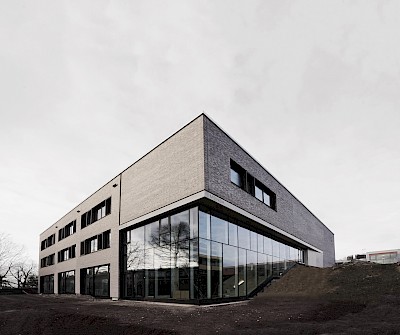 Beurteilung der Jury … Der zweigeschossige Baukörper mit auskragendem Obergeschoss überzeugt durch ein klares Erscheinungsbild. Diese Klarheit setzt sich in der inneren Struktur fort, die auf einer rechteckigen Grundfläche um eine zentrale Halle entwickelt wurde.