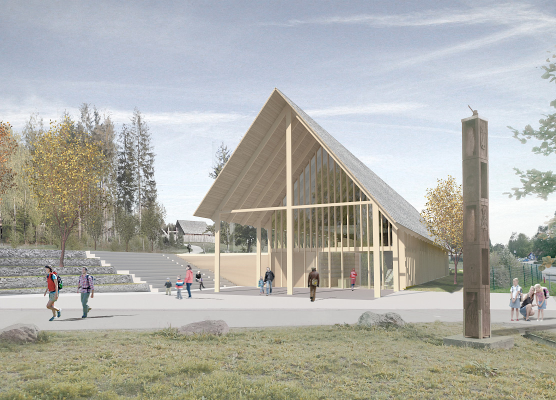 Der langgestreckte, zweigeschossige Baukörper des Neubaus des Ausstellungs- und Besucherzentrums liegt leicht von der Straße zurückversetzt. Er liegt im natürlichen Gelände und wird lediglich auf der Rückseite eingebunden, indem die Geländehöhe westlich der Arena bis zum Gebäude verlängert werden, so dass eine großflächige ebenerdige Fläche entsteht. Das markante Dach prägt sinnbildlich aus dem Straßenraum heraus das Erscheinungsbild der Gesamtanlage und ragt mit zwei Stützenstellungen in der Längsachse in einen so geschaffenen Vorbereich.